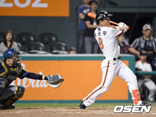[OSEN=대전,김영민기자] 27일 오후 대전 한밭야구장에서 열린 '2014 한국야쿠르트 세븐 프로야구' 한화 이글즈와 NC 다이노스 경기,8회말 2사 다섯번째 타석에서 자신의 통산 1100안타를 날리고 있다.