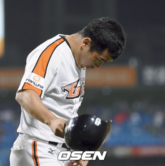 [OSEN=대전,김영민기자] 27일 오후 대전 한밭야구장에서 열린 '2014 한국야쿠르트 세븐 프로야구' 한화 이글즈와 NC 다이노스 경기,8회말 2사 다섯번째 타석에서 자신의 통산 1100안타를 날리고 팬들에게 인사를 하고 있다.