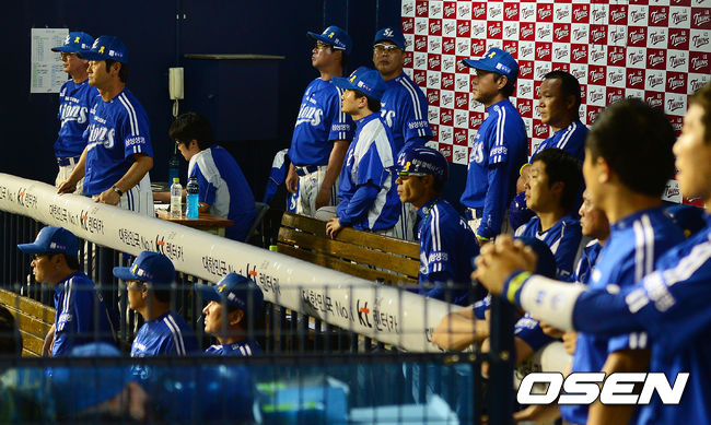 9회말 삼성 류중일 감독을 비롯한 코칭스태프, 선수들이 더그아웃에서 경기를 지켜보고 있다./jpnews@osen.co.kr