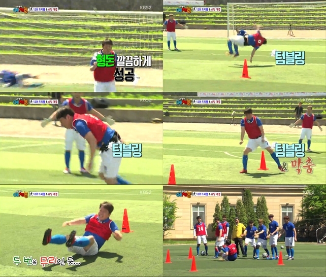 ‘예체능’ 정형돈이 기본기 훈련을 성공적으로 마친 후 텀블링으로 자축했다.