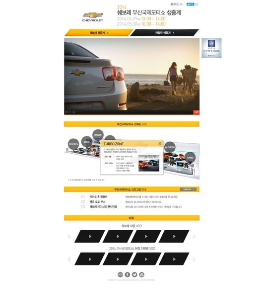 업체 측에 따르면 지난 '2012 부산국제모터쇼' 쉐보레 프레스 콘퍼런스 및 주요 이벤트 생중계는 48만여 명이 시청했으며 열흘 동안 재방송을 포함하면 모두 105만여 건이 넘는 조회수를 기록했다.