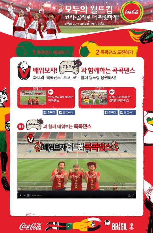 월드컵 공식 후원사인 코카-콜라사(www.cocacola.co.kr)가 짜릿한 브라질월드컵 응원을 위한 ‘콕콕댄스’를 배우고, 코카-콜라 응원 도구를 경품으로 제공하는 ‘무한도전과 함께하는 콕콕댄스’ 이벤트를 6월 30일까지 코카-콜라 페이스북(www.facebook.com/cocacola)을 통해 진행한다.
