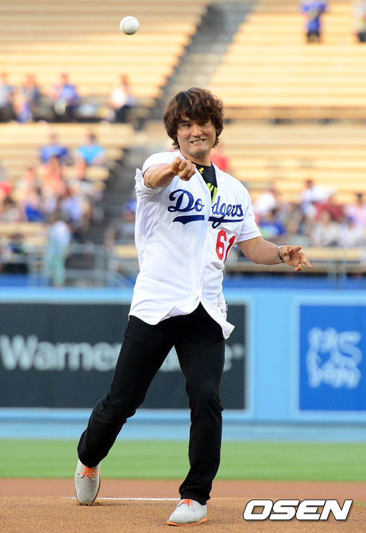 28일(이하 한국시간) 미국 캘리포니아주 로스앤젤레스 다저스타디움에서 열린 '2014 메이저리그' LA 다저스와 신시내티 레즈의 경기 시작전 '코리아 나잇'(Korea Night)행사에서 박찬호가 시구를 하고 있다.