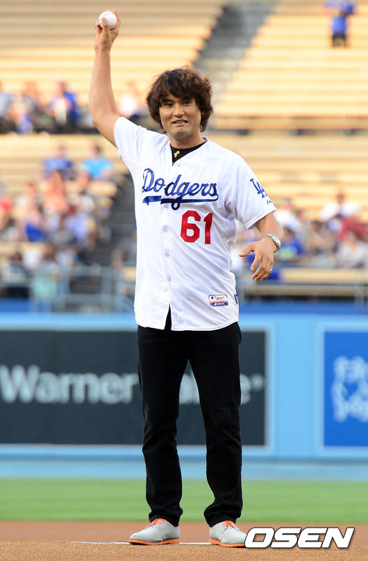 28일(이하 한국시간) 미국 캘리포니아주 로스앤젤레스 다저스타디움에서 열린 '2014 메이저리그' LA 다저스와 신시내티 레즈의 경기 시작전 '코리아 나잇'(Korea Night)행사에서 박찬호가 시구 준비를 하고 있다.