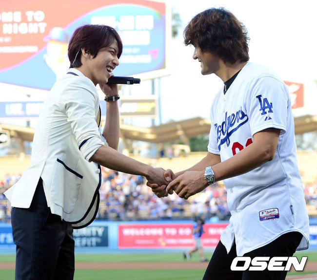 28일(이하 한국시간) 미국 캘리포니아주 로스앤젤레스 다저스타디움에서 열린 '2014 메이저리그' LA 다저스와 신시내티 레즈의 경기 시작전 '코리아 나잇'(Korea Night)행사에서 애국가를 부른 정용화가 박찬호와 악수를 나누고 있다.