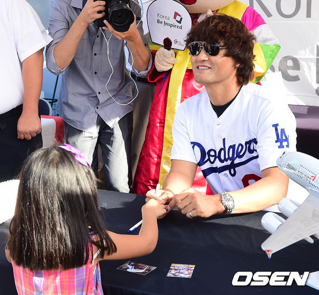 28일(이하 한국시간) 미국 캘리포니아주 로스앤젤레스 다저스타디움에서 열린 '2014 메이저리그' LA 다저스와 신시내티 레즈의 경기 시작전 '코리아 나잇'(Korea Night)행사에서 박찬호가 사인회를 갖고 있다.
