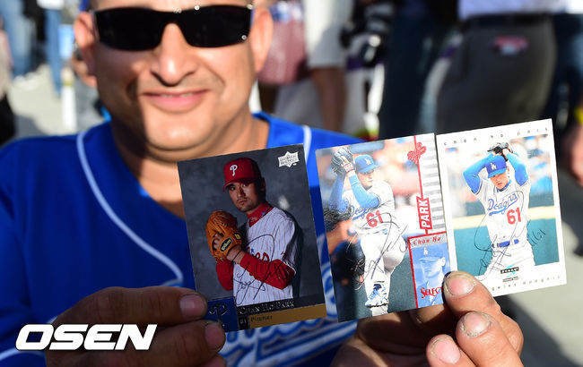 28일(이하 한국시간) 미국 캘리포니아주 로스앤젤레스 다저스타디움에서 열린 '2014 메이저리그' LA 다저스와 신시내티 레즈의 경기 시작전 '코리아 나잇'(Korea Night)행사에서 한 팬이 박찬호에게 받은 사인을 들어 보이고 있다.