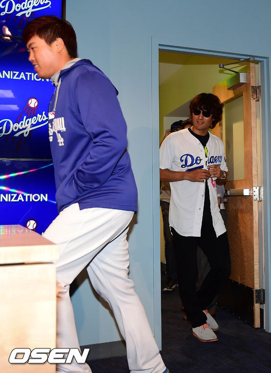 28일(이하 한국시간) 미국 캘리포니아주 로스앤젤레스 다저스타디움에서 열린 '2014 메이저리그' LA 다저스와 신시내티 레즈의 경기 시작전 '코리아 나잇'(Korea Night)행사에 참석한 박찬호가 류현진과 함께 기자회견장에 입장하고 있다.