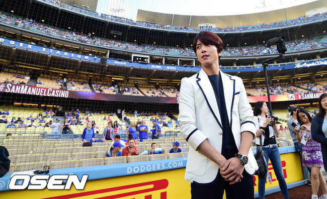 28일(이하 한국시간) 미국 캘리포니아주 로스앤젤레스 다저스타디움에서 열린 '2014 메이저리그' LA 다저스와 신시내티 레즈의 경기 시작전 '코리아 나잇'(Korea Night)행사에 정용화가 참석하고 있다. 정용화는 이날 다저스구장에서 애국가를 불렀다.