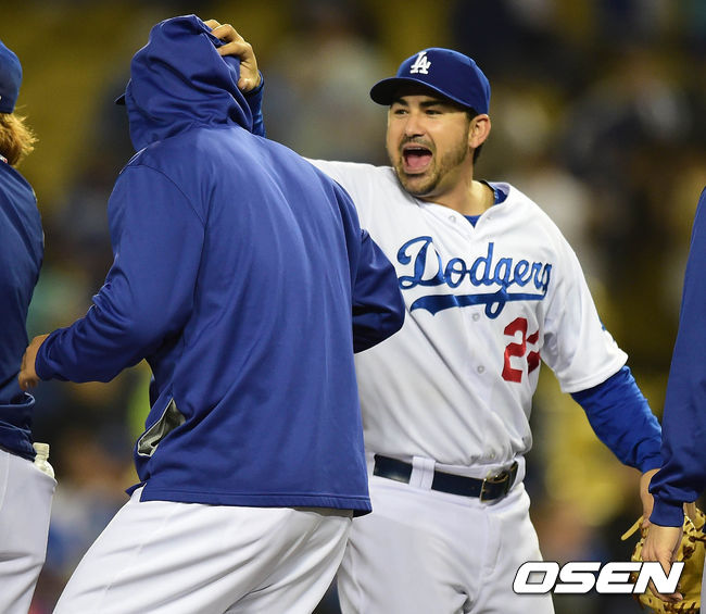 28일(이하 한국시간) 미국 캘리포니아주 로스앤젤레스 다저스타디움에서 열린 '2014 메이저리그' LA 다저스와 신시내티 레즈의 경기 종료 후 곤살레스가 류현진의 머리를 잡고 장난치고 있다.