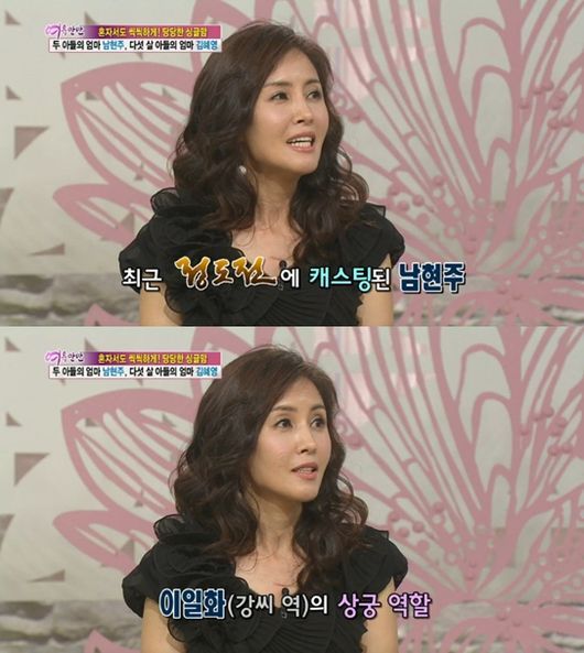 이날 남현주는 "오늘 대본 연습하고 내일 녹화한다"며 '정도전' 촬영에 앞서 설레는 마음을 전했다. 이어 그는 '정도전'에서 맡은 역에 대해 "이일화 씨가 연기하고 있는 강씨의 상궁 역할"이라고 설명했다.