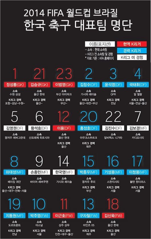 브라질 월드컵에 출전할 한국대표팀 선수 23명 중 현역 K리거는 6명, K리그 출신 해외파는 11명이다. 23명중 17명이 K리그가 키워낸 스타들이다. 홍명보 감독, 김태영 코치, 박건하 코치 등 대표팀 코칭스태프들도 현역 시절 K리그 최고의 스타들이었다.