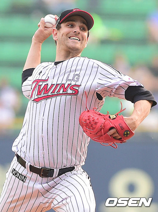 LG 선발 리오단이 힘차게 공을 뿌리고 있다.
