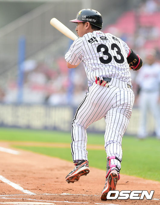 1회말 LG 공격 선두타자로 나선 박용택이 좌전안타를 날리고 있다.