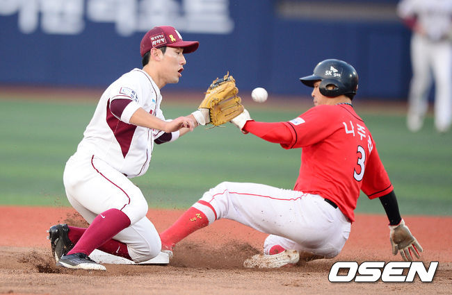 2회초 2사 1루에서 SK 나주환이 넥센 서건창의 태그에 앞서 2루 도루에 성공하고 있다.