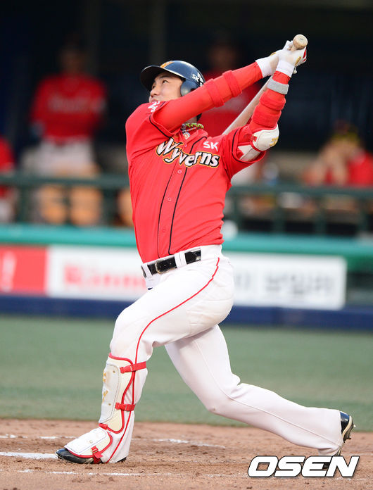 3회초 2사 1,2루에서 SK 김강민이 시즌 9호 선제 스리런를 날리고 타구를 바라보고 있다.