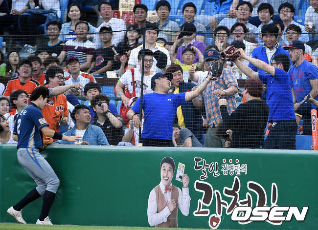 [OSEN=대전,김영민기자] 28일 오후 대전 한밭야구장에서 열린 '2014 한국야쿠르트 세븐 프로야구' 한화 이글즈와 NC 다이노스 경기,2회말 2사 1루 최진행의 1루 파울타구때 NC 박민우 2루수가 수비를 펼치고 있다.