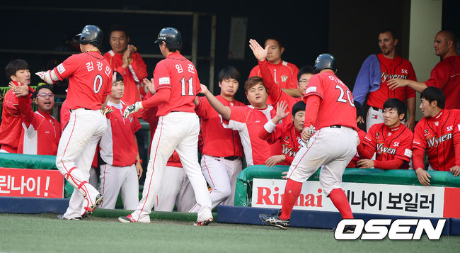 3회초 2사 1,2루에서 SK 김강민이 시즌 9호 선제 스리런를 날리고 더그아웃에서 동료선수들과 하이파이브를 하고 있다.