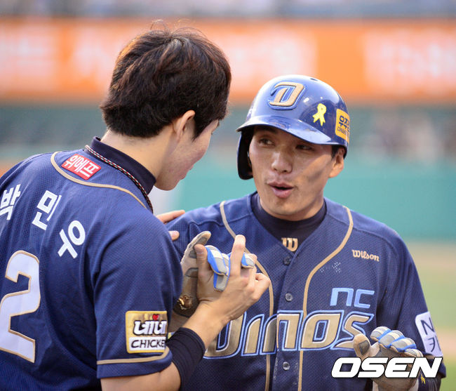 [OSEN=대전,김영민기자] 28일 오후 대전 한밭야구장에서 열린 '2014 한국야쿠르트 세븐 프로야구' 한화 이글즈와 NC 다이노스 경기,3회초 무사 1루 나성범 적시타때 1루주자 이종범 득점을 올리며 박민우의 환영을 받고 있다.