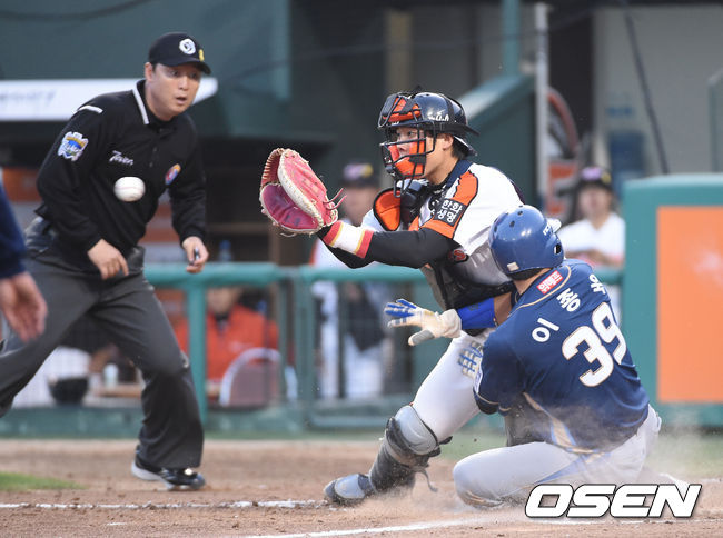 [OSEN=대전,김영민기자] 28일 오후 대전 한밭야구장에서 열린 '2014 한국야쿠르트 세븐 프로야구' 한화 이글즈와 NC 다이노스 경기,3회초 무사 1루 나성범의 적시타때 1루주자 이종욱 홈까지 쇄도 득점을 올리고 있다.