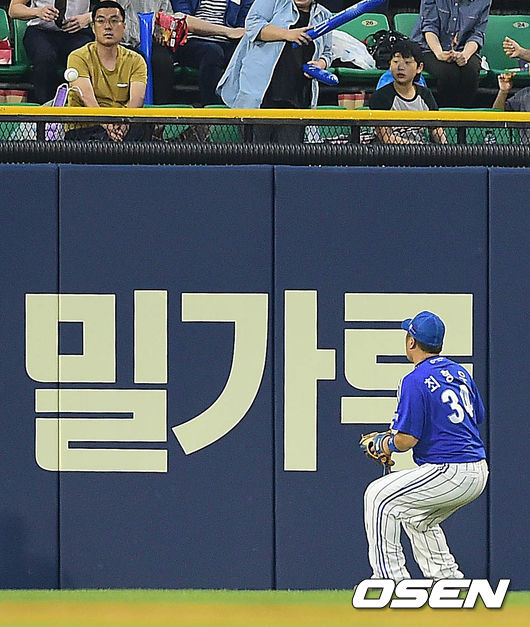 4회말 LG 공격 2사 주자없는 상황 이병규의 2루타가 좌측 펜스 상단을 맞고 있다.