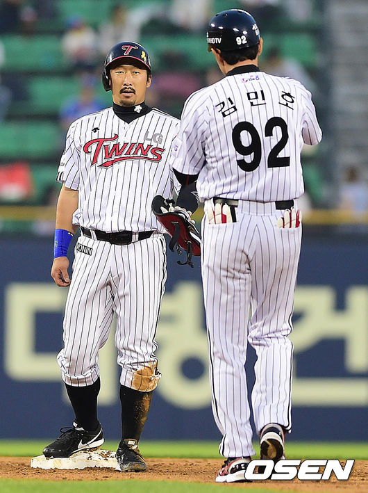 4회말 LG 공격 2사 주자없는 상황 이병규가 좌측 펜스 상단을 맞히는 2루타를 날리고 김민호 코치와 인사를 나누고 있다.