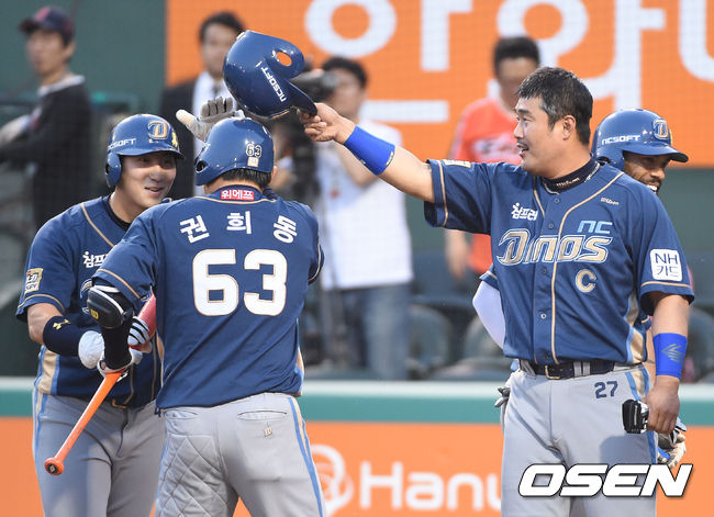 [OSEN=대전,김영민기자] 28일 오후 대전 한밭야구장에서 열린 '2014 한국야쿠르트 세븐 프로야구' 한화 이글즈와 NC 다이노스 경기,3회초 1사 만루 권희동 만루 홈런을 날리고 선행주자의 축하를 받고 있다.