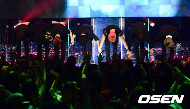 28일 오후 서울 마포구 상암동 누리꿈 스퀘어에서 진행된 MBC MUSIC '쇼 챔피언'에서 1위를 차지한 인피니트가 팬들에게 인사를 하고 있다.