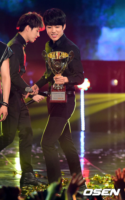 28일 오후 서울 마포구 상암동 누리꿈 스퀘어에서 진행된 MBC MUSIC '쇼 챔피언'에서 1위를 차지한 인피니트 성열이 우승 트로피를 들고 기뻐하고 있다.