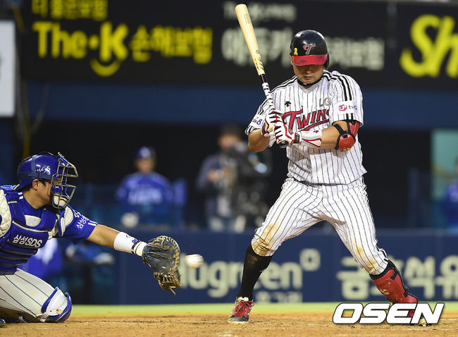4회말 LG 공격 2사 만루 상황 최경철이 삼성 선발 마틴의 공에 서서 삼진을 당하고 있다.