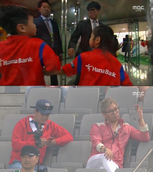 이날 윤후와 송지아 등 아이들은 국가대표 선수들과 함께 대기실에서 포착됐다. 정웅인, 윤민수는 관객석에서 카메라를 든 채 필드를 응시하고 있는 모습이었다.