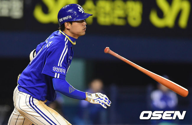 5회초 삼성 공격 1사 1루 상황 김상수가 우중간을 가르는 3루타를 날리고 있다.