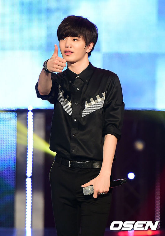 28일 오후 서울 마포구 상암동 누리꿈 스퀘어에서 진행된 MBC MUSIC '쇼 챔피언'에서 1위를 차지한 인피니트 성종이 팬들에게 사인을 보내고 있다.