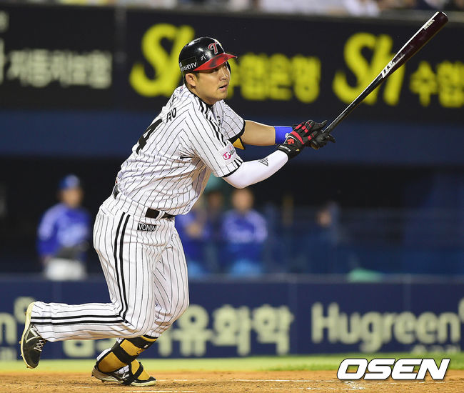 5회말 LG 공격 1사 1, 2루 상황 정의윤이 우익수 오른쪽으로 흐르는 동점 2루타를 날리고 있다.