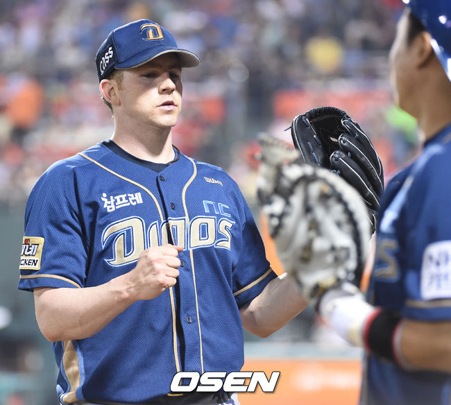 [OSEN=대전,김영민기자] 28일 오후 대전 한밭야구장에서 열린 '2014 한국야쿠르트 세븐 프로야구' 한화 이글즈와 NC 다이노스 경기, NC 선발 에릭이 5회말 수비를 마치고 공수교대때 덕아웃을 향하고 있다.
