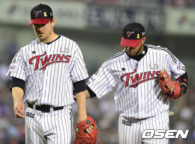 6회초 삼성 공격을 삼자범퇴로 막아낸 LG 선발 리오단이 더그아웃으로 들어오며 3루루 조쉬 벨의 격려를 받고 있다.