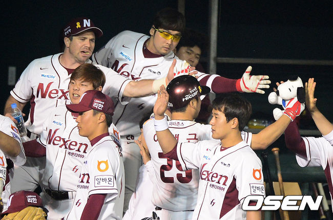 6회말 1사 1,2루에서 넥센 이택근이 스리런포를 날리고 더그아웃에서 동료선수들과 하이파이브를 하고 있다.