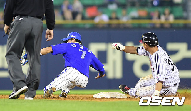 6회말 LG 공격 2사 1루 상황 주자 박용택이 2루 도루에 성공하고 있다.