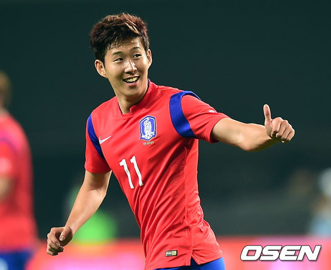28일 오후 서울월드컵경기장에서 '2014 브라질 월드컵' 한국- 튀니지의 평가전, 전반 한국 손흥민이 패스를 한 동료에게 엄지손가락을 들어보이고 있다.