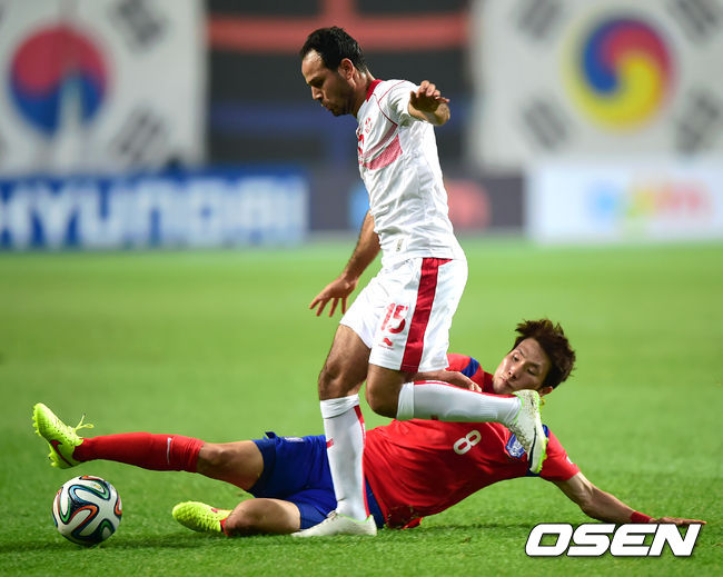 28일 오후 서울월드컵경기장에서 '2014 브라질 월드컵' 한국- 튀니지의 평가전, 전반 한국 한국영이 튀니지 선수에게 태클을 하고 있다.
