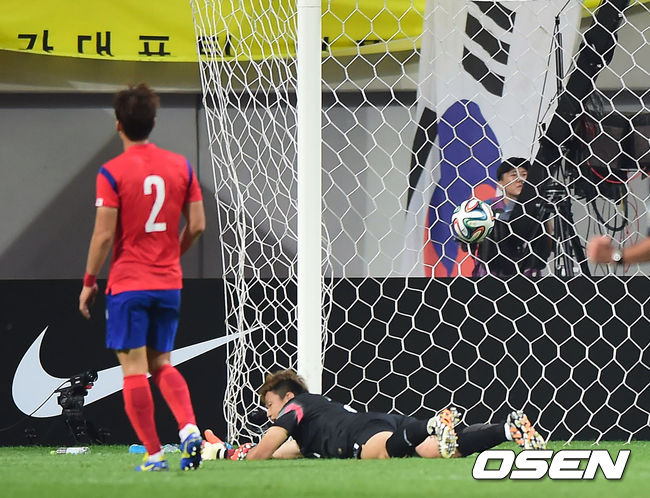 28일 오후 서울월드컵경기장에서 '2014 브라질 월드컵' 한국- 튀니지의 평가전, 전반 튀니지 다우아디에게 한국 정성룡 골키퍼가 선제골을 허용하고 있다.