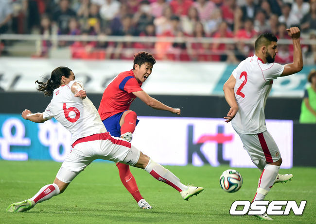 28일 오후 서울월드컵경기장에서 '2014 브라질 월드컵' 한국- 튀니지의 평가전, 전반 한국 손흥민이 튀니지 문전에서 강슛을 날리고 있다.