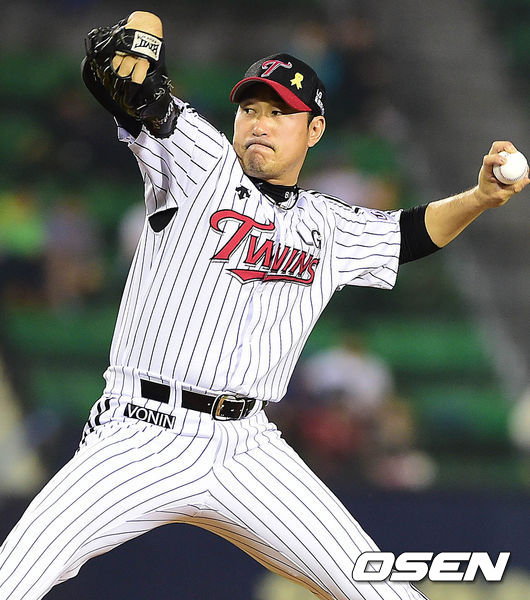 8회초 삼성공격 2사 주자없는 상황 마운드에 오른 LG 투수 봉중근이 힘차게 공을 뿌리고 있다.