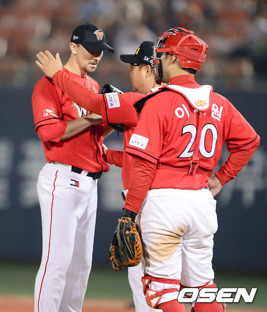 8회말 무사 1루에서 SK 울프가 마운드에서 내려오고 있다.