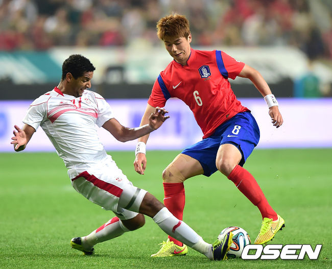 28일 오후 서울월드컵경기장에서 '2014 브라질 월드컵' 한국- 튀니지의 평가전, 전반 한국 기성용이 현란한 개인기로 튀니지 수비를 제치고 있다.