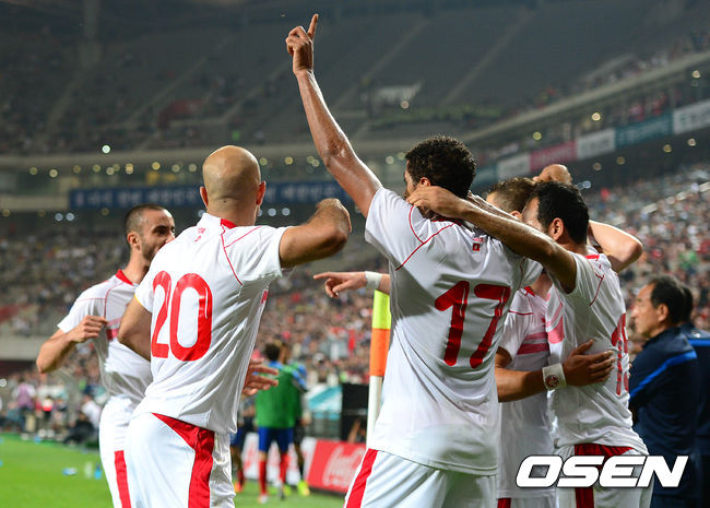 28일 오후 서울월드컵경기장에서 '2014 브라질 월드컵' 한국- 튀니지의 평가전, 전반 튀니지 다우아디가 선제골을 성공시키고 환호하고 있다.