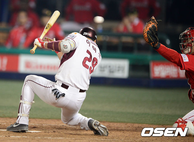 8회말 무사 1,2루에서 넥센 이택근이 번트를 시도하다 SK 박정배의 높은 볼에 깜짝 놀라고 있다.