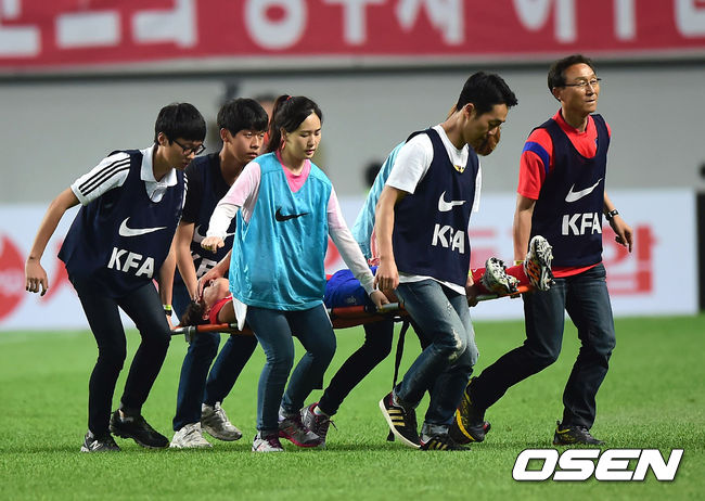28일 오후 서울월드컵경기장에서 '2014 브라질 월드컵' 한국- 튀니지의 평가전, 후반 부상을 당한 홍정호가 들것에 실려나오고 있다.