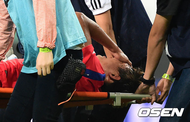 28일 오후 서울월드컵경기장에서 '2014 브라질 월드컵' 한국- 튀니지의 평가전, 후반 한국 홍정호가 튀니지 아이삼 제마의 반칙으로 들것에 실려 나가고 있다.