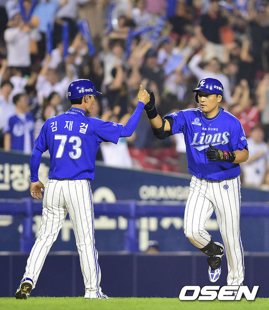 8회초 삼성 공격 2사 1, 2루 상황 이승엽이 역전 우월 스리런포를 날리고 그라운드를 돌며 김희걸 코치와 인사를 나누고 있다.
